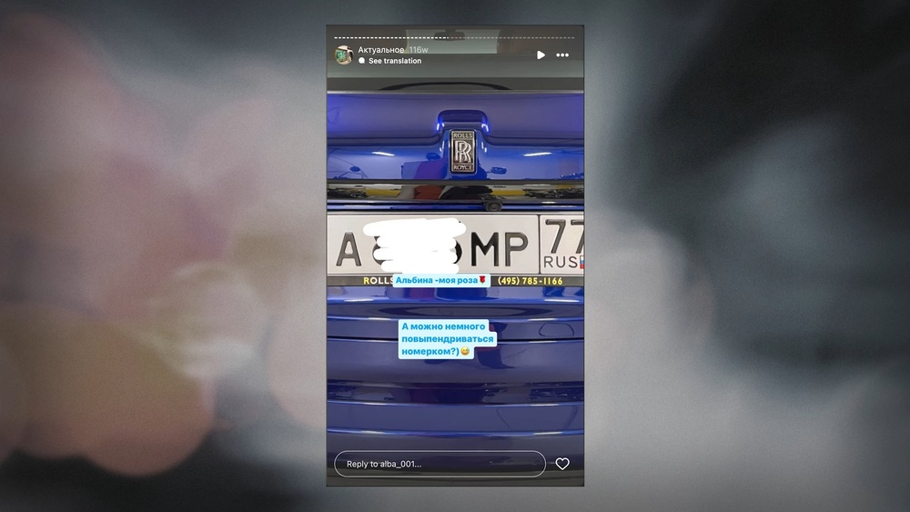 Это, кстати, второй ее Роллс-Ройс. Один у нее уже был, куплен за полгода до этого спонтанного апрельского шоппинга. Предыдущий это Роллс-Ройс Каллинан — синенький, такой стоит 95 млн. Вот Альбина постит его номера и пишет, что буковки АМР — это значит «Альбина моя Роза».