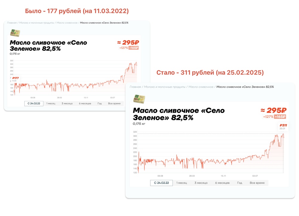 Его абсолютно не волнует, что упаковка масла в январе прошлого года стоила 178 рублей, а сейчас — 311. Что могло случиться с маслом в великой державе?