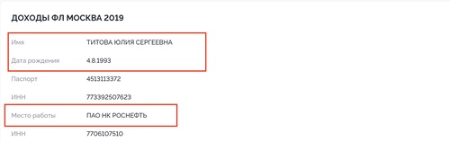 Просто из любопытства проверяем, кто это, и выясняется, что это тоже сотрудница Роснефти. Она работала там с 2016 по конец 2018, заработала восемь с лишним миллиона рублей. Параллельно зарплату ей платила и ННК Худайнатова (почти шесть млн).