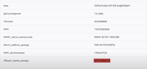 Потом этот гений конспирации на какое-то время полностью сменил себя имя. Игорь Иванович Сечин по документам превратился в Сергея Андреевича Терентьева. Но номер ИНН поменять забыли. Так мы узнали, что в 2020 году Терентьев (ну а точнее — Сечин) заработал в «Роснефти» более трех миллиардов рублей. Это примерно 12 млн рублей за каждый рабочий день.