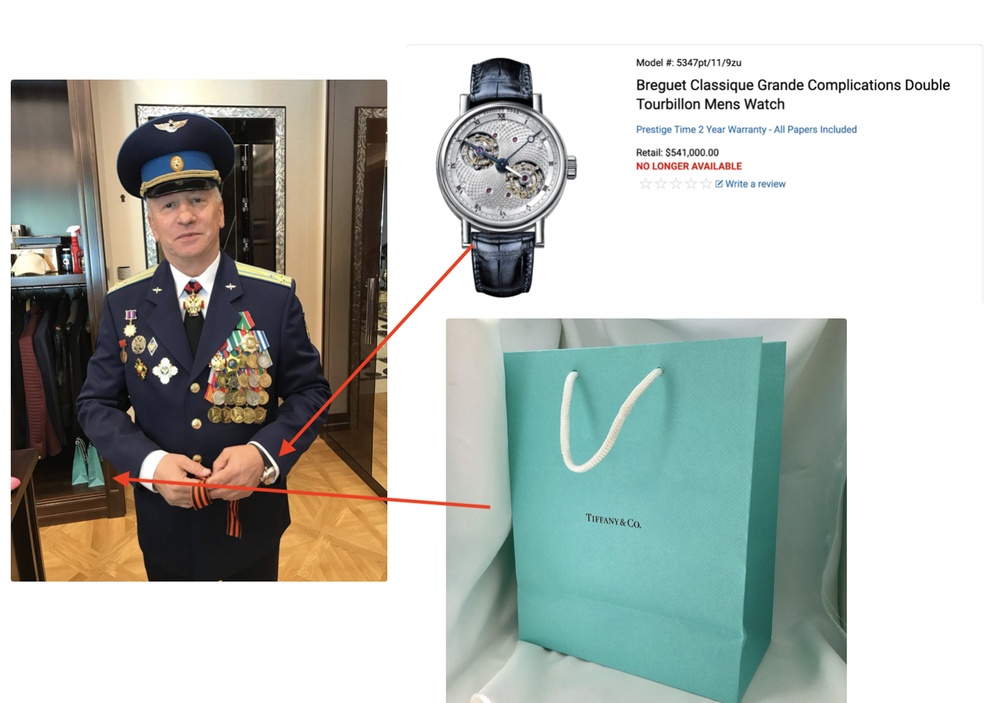 И ничего не выдает в нем подвоха. Ну разве что кроме пакетиков от украшений Тиффани, скромно сложенных за его спиной, и часов Бреге за 45 миллионов рублей.