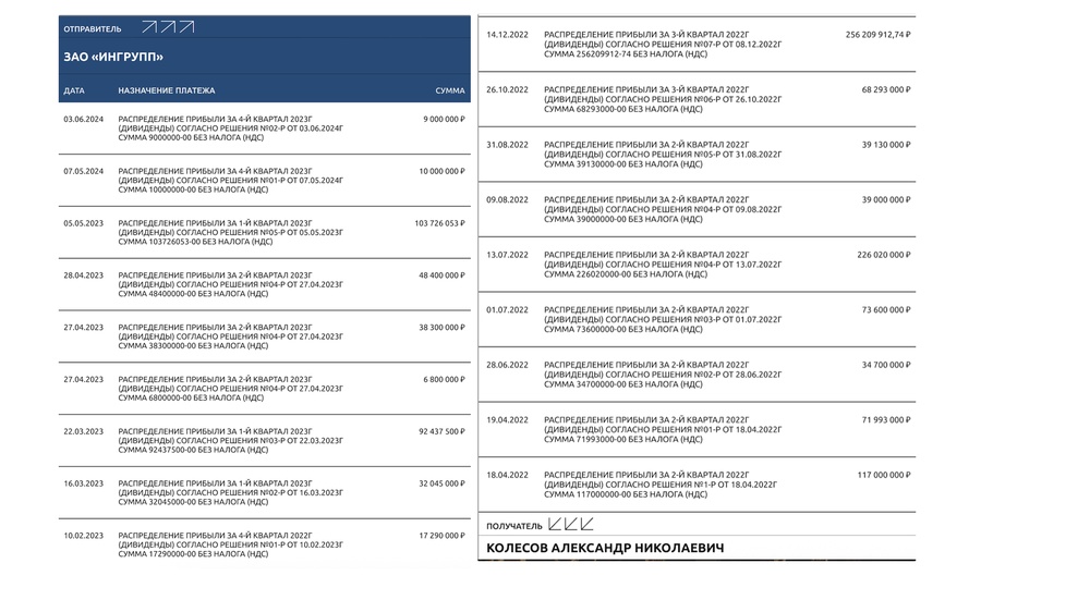 Ингрупп зарегистрировала родившаяся в 1935 году Крайнова Диляра Мухсиновна. Она прописана по одним адресам с первой женой Колесова и летала вместе с ней на семейном джете. Скорее всего, это первая теща Николая Колесова.