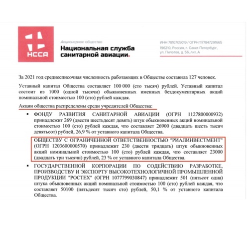 А еще долей в Национальной Службе Санитарной Авиации, это единый оператор всех медицинских вертолетов в стране.