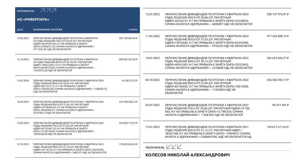 Почти 4 миллиарда рублей от компании Риверпарк получил сам Николай Колесов