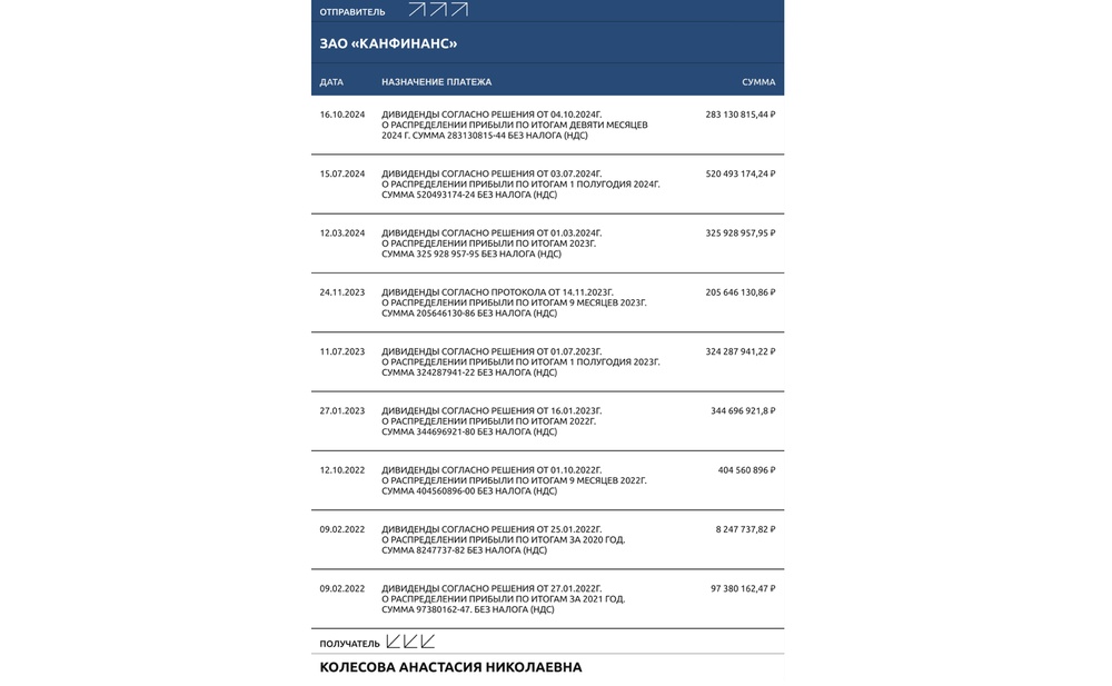 Канфинанс выплатил дивидендов на сумму 2,5 миллиарда рублей и они достались Анастасии Колесовой, старшей дочери Николая Колесова.