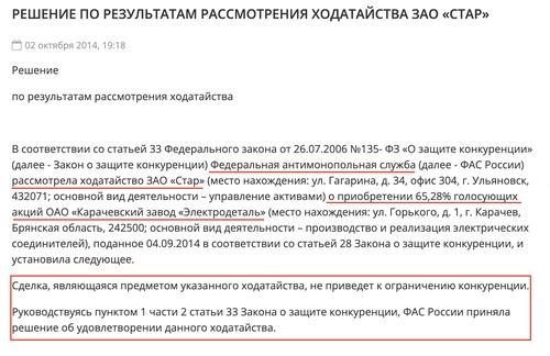 Разберемся на нескольких примерах. Карачевский завод «Электродеталь», 1000 сотрудников, Брянская область. Делают электрические соединители для истребителей и подлодок. В 2014 КРЭТ выставляет 2/3 акций на продажу. Они достаются АО Стар, которое мы знаем как одного из собственников трех вилл на Майорке.