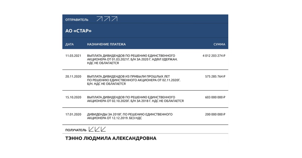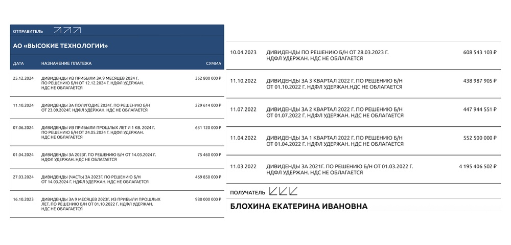 Блохина получила дивиденды от Высоких Технологий — почти 9 миллиардов рублей.