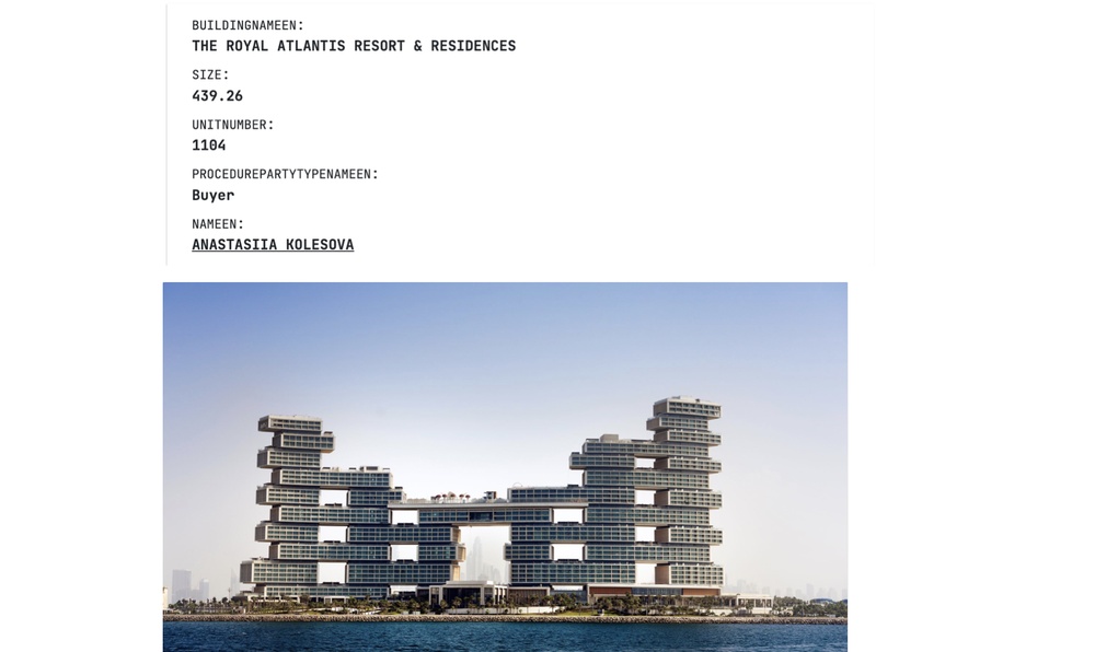 Но и это еще не все. Остались ведь еще дети! Там же, на Пальм-Джумейре, мы нашли у старшей дочери Колесова Анастасии 440 метровую квартиру. Она находится знаменитом комплексе THE ROYAL ATLANTIS, стоит такая сейчас 23 миллиона долларов.