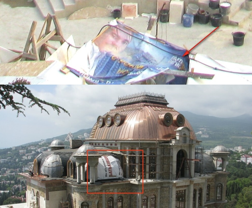 На некоторых фотографиях можно найти подсказку, которая сильно сузит поиск его местоположения — билборды украинских партий Батькивщина и Партии Регионов, которые используют вместо брезента.