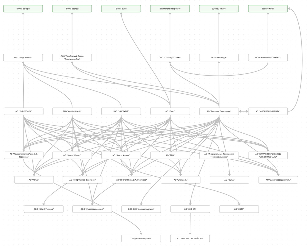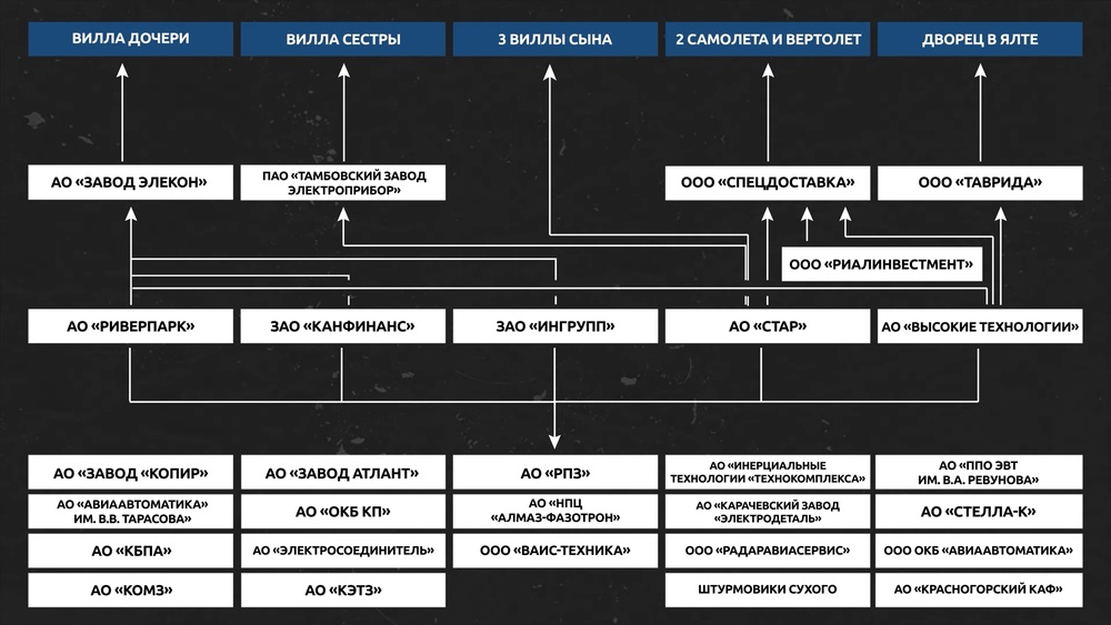 На ней объекты недвижимости: пять испанских вилл, ялтинский дворец, два самолета, вертолет. Дальше идет список компаний на которые они записаны или были записаны, и компаний, на которые записаны эти компании.