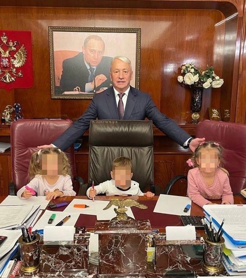 Там мы и нашли нашу Николь Колесову, девочку, которая в 4 года купила у завода Элекон испанскую виллу за пять миллионов евро. Вот их семейный портрет: слева Николь, справа ее сестра-двойняшка Анна, а ребенок поменьше в центре — Алексей Колесов, 2019 года рождения. По центру их папа. Ну и Путин, конечно же.