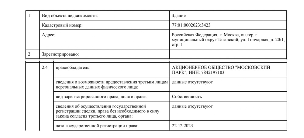 Но потом неожиданно в 2023 году оказывается, что актив этот непрофильный, здание и землю выставляют на продажу (примерно в 4-5 раз дешевле реальной стоимости) и по стартовой цене его покупает никому неизвестная фирма «Московский парк».
