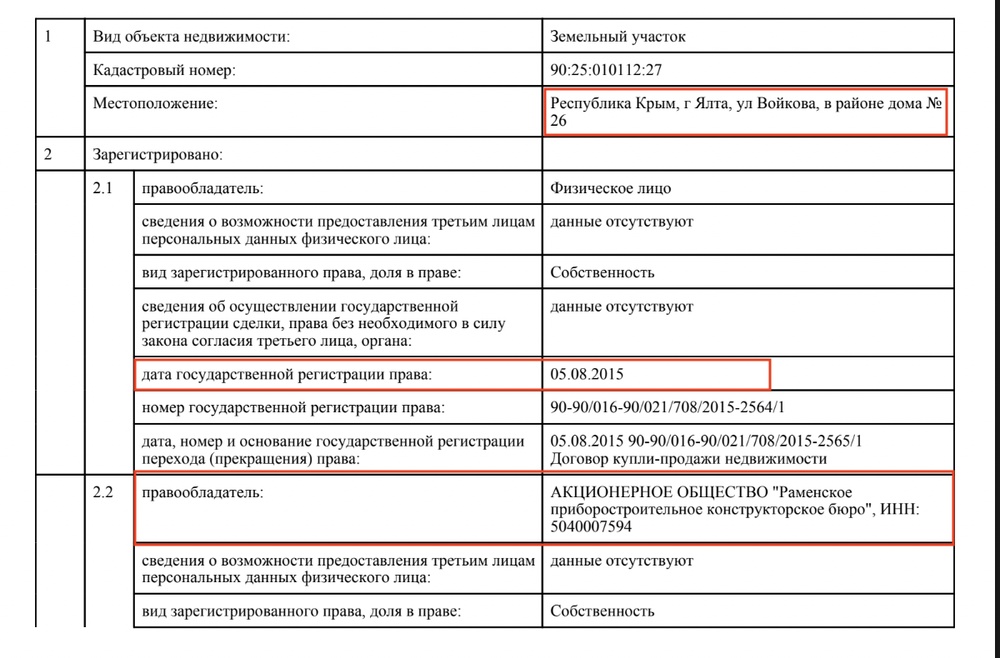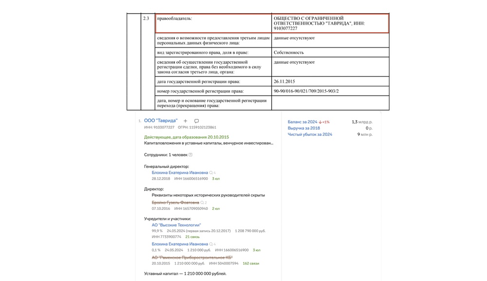 Строили этого монстра в стиле цыганское барокко в начале 2010-х. Кто должен был стать владельцем в Украине мы не знаем, но в 2015 году, после аннексии Крыма, собственником оказывается… Раменское приборостроительное конструкторское бюро — государственное оборонное предприятие, входящее в холдинг КРЭТ, который возглавлял Колесов