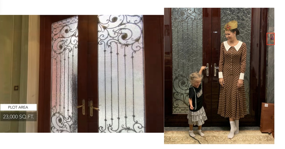 Точно такая же входная дверь у Дианы за спиной. Правда, Колесовы усовершенствовали фойе своей дубайской виллы православной иконой-наклейкой, благословляющей гостей и хозяев. Да и в целом видео снятые внутри (очень патриотические) полностью совпадают с тем, как выглядят эти виллы в рекламных проспектах.