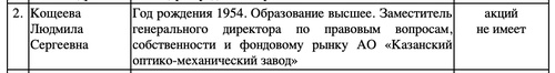 Еще она работает заместителем генерального директора по правовым вопросам Казанского оптико-механического завода.
