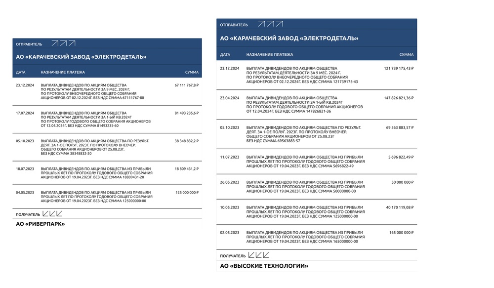 Оставшаяся часть завода Электродеталь в 2023 году оказалась в собственности компаний Канфинанс, Ингрупп, Риверпарк и АО Высокие Технологии.