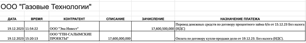 Открываем их банковские проводки «Новая Системы» и видим, что за 2 минуты (!) до того, как они отправили эту гигантскую сумму «ВГ Инвесту», они их получили в виде беспроцентного займа от еще одной фирмы из Санкт-Петербурга — «Эна Инвест».
