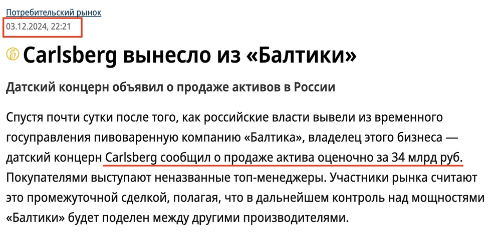 В этот день, 3 декабря 2024 года, как мы знаем из новостей, Карлсберг продал «Балтику», ровно за эту сумму.