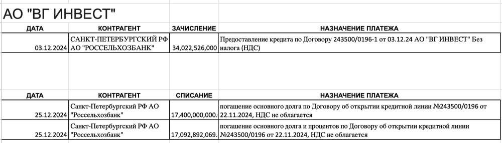 Факт выдачи такого гигантского кредита фирме, которая его ничем не может обеспечить, — это уже огромная аномалия и признак того, что происходит явно что-то не то. Но ладно, может быть, они будут выплачивать кредит и проценты следующие 50 лет из будущих доходов — кто знает. Но не тут-то было. Чтобы вернуть 34 млрд этому «ВГ Инвесту», понадобилось всего 22 дня. Где они взяли деньги?