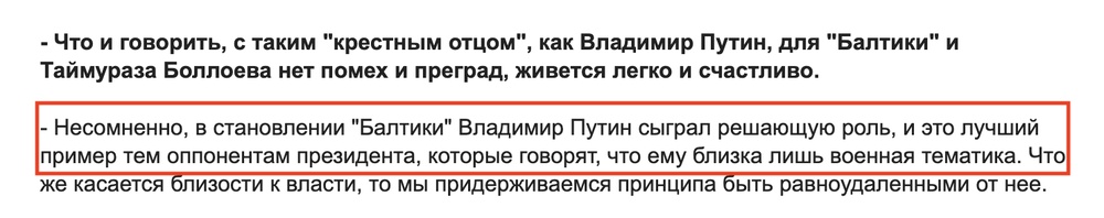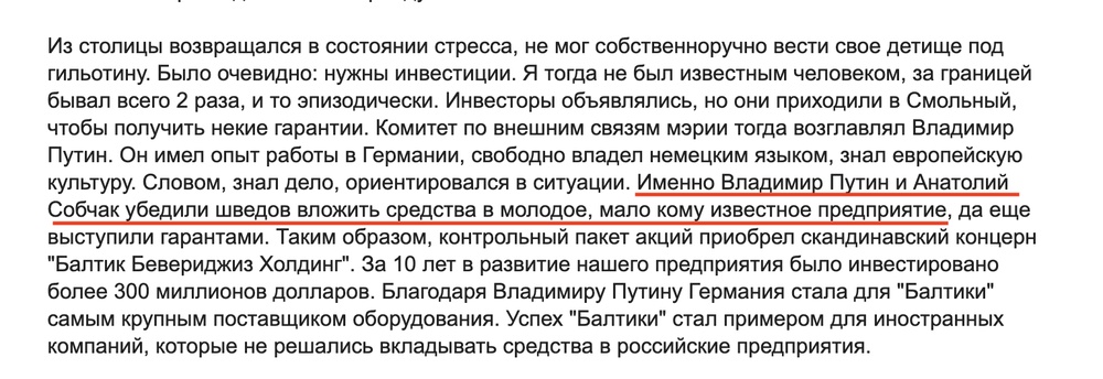 В интервью Боллоев объясняет, что ничего бы не получилось, если бы не Путин, который в начале 90-х работал в комитете мэрии по внешним связям, и очень сильно помог «Балтике». Он сумел найти и уговорить иностранные компании инвестировать в «Балтику»: