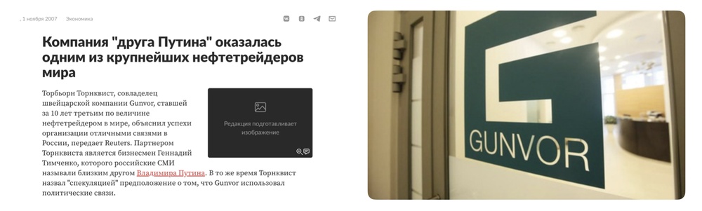 Это вызывало абсолютное недоумение на рынке и все задавали вопросы: кто такой Тимченко и не связан ли он как-то лично с Путиным? В статьях об умопомрачительном успехе Гунвора Тимченко постоянно называли другом Путина, приятелем Путина, партнером Путина и так далее. Но и доказательств тогда никаких особо не было да и сам Тимченко все категорически отрицал.