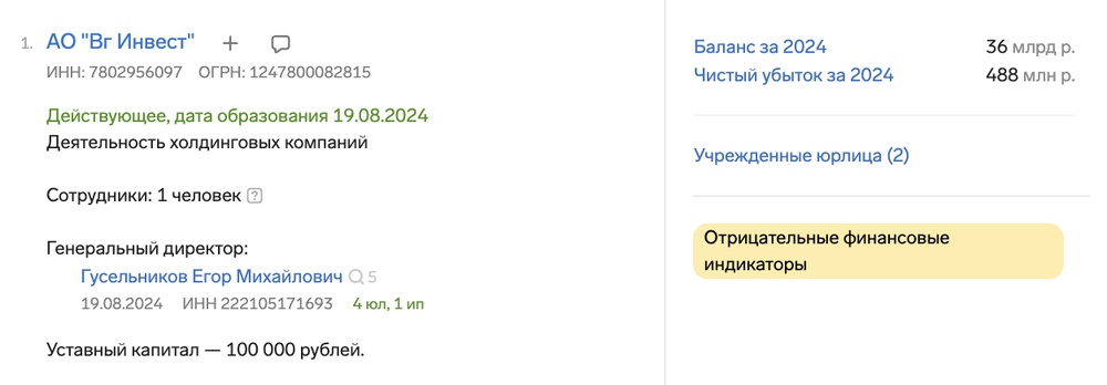 Начнем с фирмы «ВГ Инвест», которая принадлежит топ-менеджерам «Балтики», и которая якобы купила завод у иностранцев. Ее создали в августе 2024 года и там не происходило ровным счетом ничего примечательного. Никакого бизнеса: какие-то мелкие платежи за банковские услуги, нотариусу, налоги на 11 000 рублей, в общем фирма-пустышка.