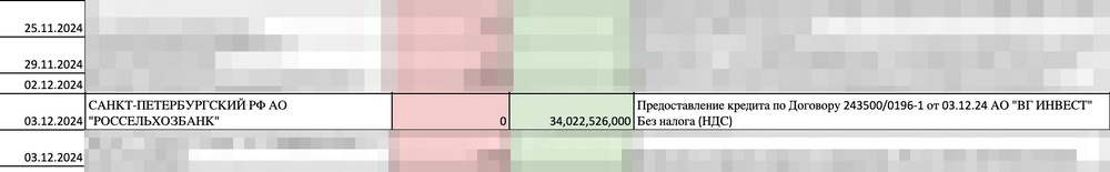 25 декабря на счет «ВГ Инвет» поступает 34 млрд рублей от АО «Новая система». Это следующее звено. И именно этими деньгами в течение нескольких минут они выплачивают кредит Россельхозбанку.