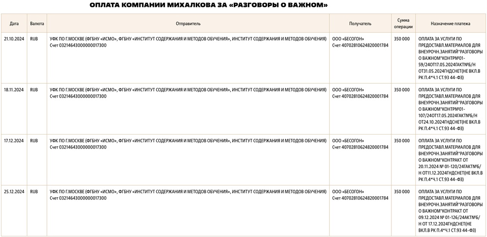 За каждый такой мини-кусочек, показанный на уроках в школе, Михалков получает 350 000 рублей. За два месяца 2024 года в «Разговорах о важном» показали 4 таких фрагмента. И на счёт фирмы Михалкова, ООО «Бесогон», поступили, соответственно, 1 миллион 400 тысяч рублей.