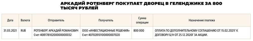 Это видео, на котором Ротенберг говорит, что купил «апарт-отель» несколько лет назад было показано в эфире 30 января 2021 года. Ничем на тот момент, он, естественно, не владел — ни несколько лет, ни несколько месяцев, ни одного дня. Собственником дворца он станет только 2 месяца спустя — 31 марта 2021 года. Как мы видим по банковским проводкам, Ротенберг за 800 000 рублей купил 100% акций фирмы «Бином» у «Инвестиционных решений» и, соответственно, дворец теперь действительно принадлежит ему.